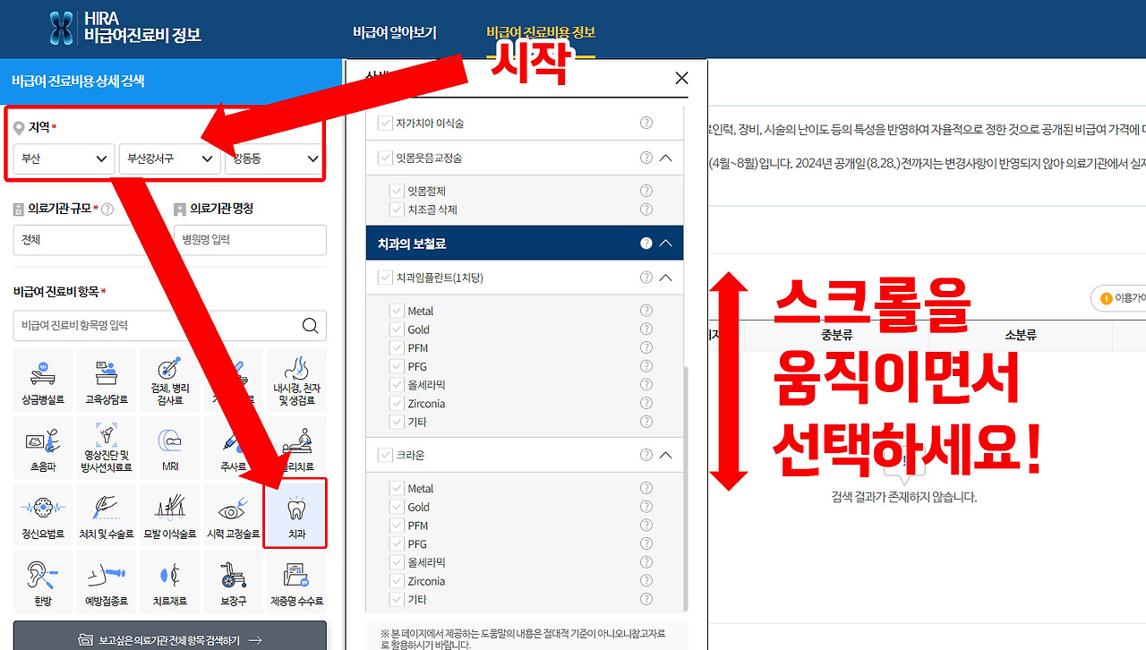 지역만 선택하세요. 원하는 지역만 선택 후 아래 바로 아래 '치과'를 선택하면 진료 항목이